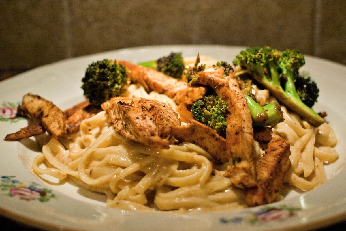 Naporcované kousky kuřete položíme na těstoviny a ještě krátce zapečeme.