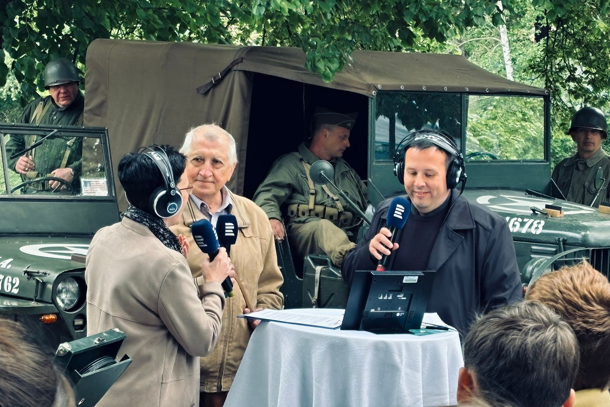 Moderátoři Iva Kokešová a Vladimír Šťovíček přivítali mezi hosty svého času nejmladšího hlasatele Československého rozhlasu Karla Sedláčka, který byl za mikrofonem také v srpnu 1968.