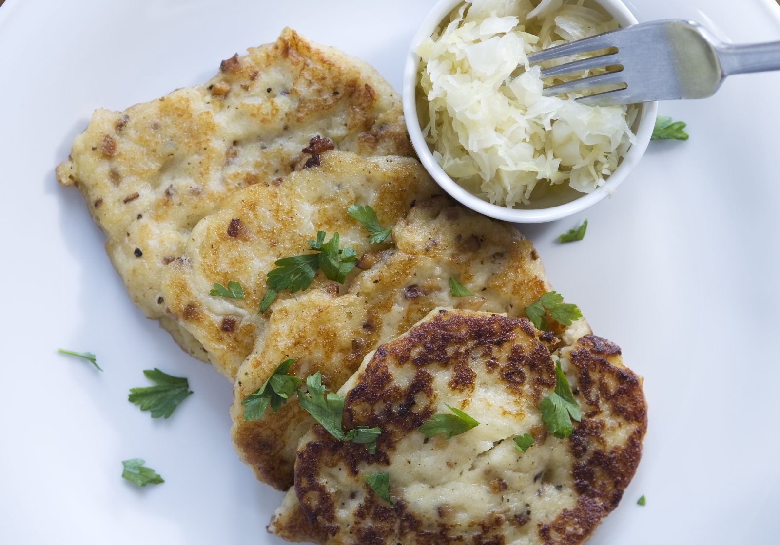 Oloupané syrové brambory nastrouháme, vodu z brambor slijeme, přidáme mouku, vejce, mléko, sůl a jablka. Vše dobře promícháme a nalijeme na vymazaný předehřátý plech (olej musí být horký) a pečeme, pokud je potřeba, těsto otočíme a dopečeme.