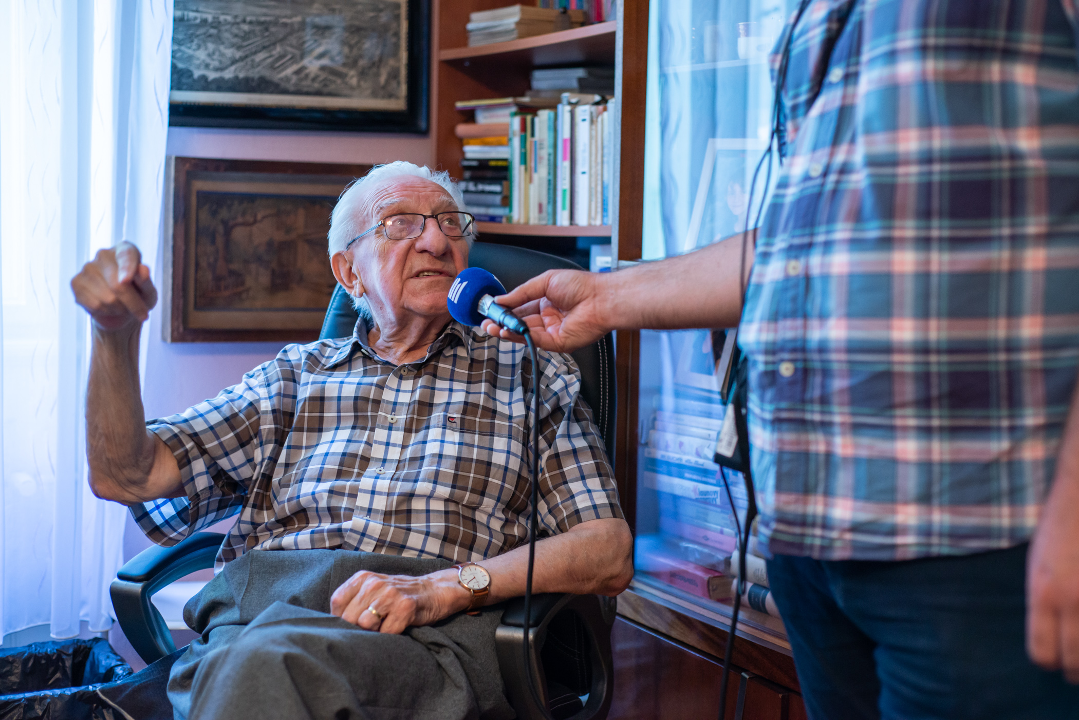 Je tu i starý stůl, kde Gustav sedává a pracuje. Je stále u stejného okna, i přestože Gustav změnil byt. Když se musel kvůli vysokému nájmu stěhovat z vedlejšího třípokojového bytu, majitel domu byl tak vstřícný, že mu přesunul příčku mezi byty, aby mohl Gustav sedět u stále stejného okna, jak byl zvyklý. Na stole najdete počítač, tiskárnu i odložený mobilní telefon. To vše ve svém věku, více než 90 let, používá ke své práci. Facebook ale nemá, jak říká: „Ani nevím, kde se to chytá.“