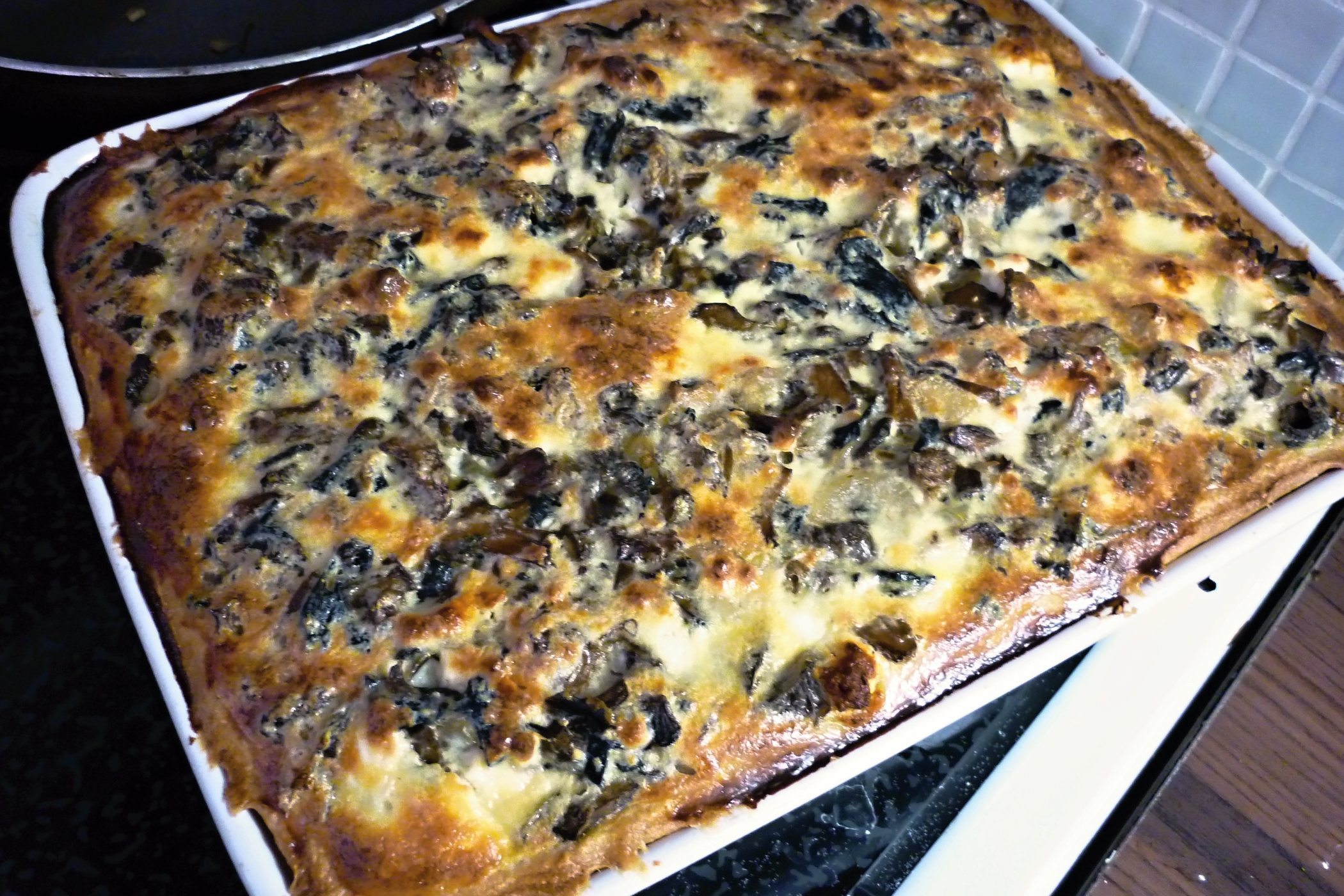 Hmotu pak vlijeme do máslem vymazaného a strouhankou vysypaného pekáče. Uhladíme a na povrch ještě poklademe plátky másla.
