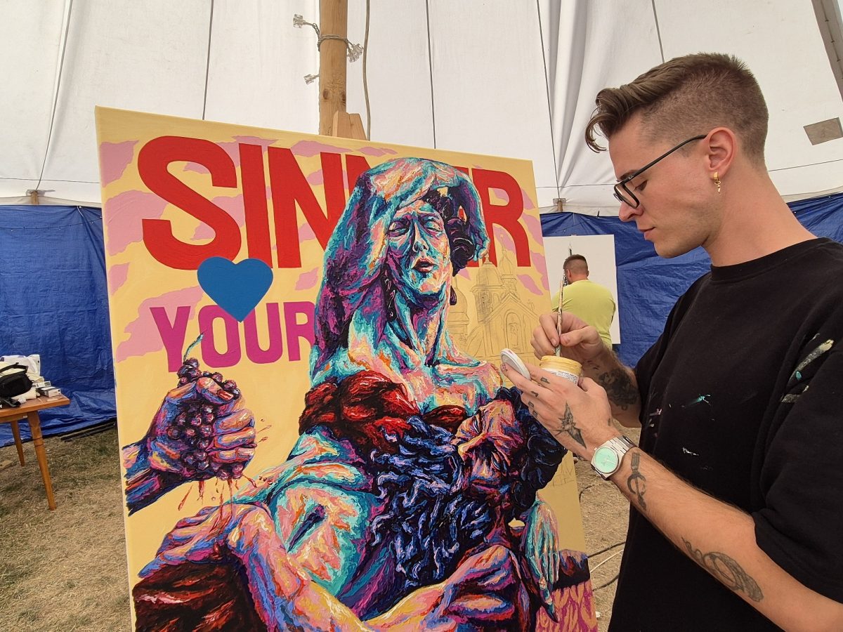 Mezi umělci, kteří tvořili velkoplošné obrazy na sympóziu ve Valči, byl i Ondřej Michálek z Prahy, vystavující pod pseudonymem Mio. Inspiroval se jednou ze soch v parku ve Valči, kterou tvoří postava hříšnice ve spárech vousatého muže. V pozadí je pak kostel Nejsvětější Trojice ve Valči.