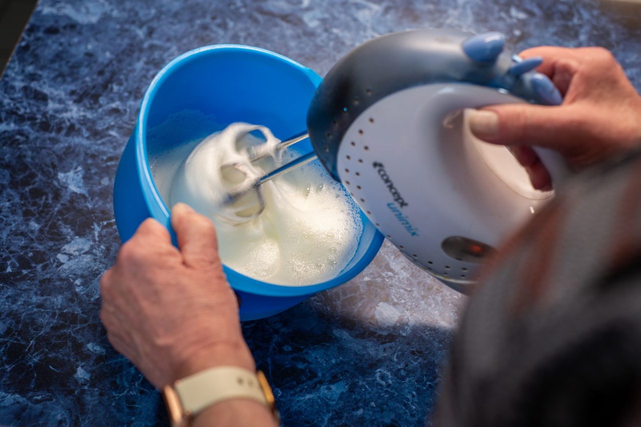 K bílkům přidáme vanilkový cukr a vyšleháme tuhý sníh. Ten zlehka pomocí stěrky zapracujeme do rohlíkové hmoty.