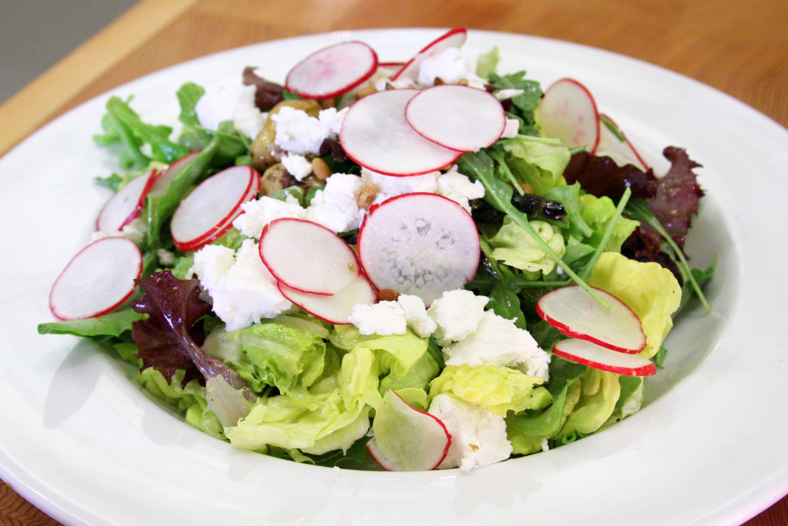 Ředkvičky a uvařená vajíčka nakrájíme na kolečka, salát natrháme na kousky, vše osolíme, opepříme.