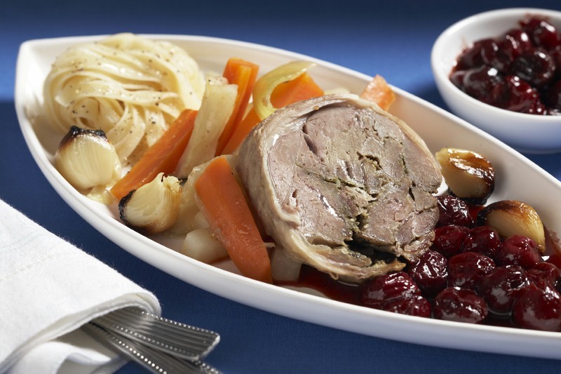 Do pánve s rozpuštěným máslem nasypeme nakrájenou kořenovou zeleninu, cibuli,cukr, divoké koření a vše osmahneme do tmavohněda. Přidáme 2 lžíce octa a zalijeme vařící vodou. Vložíme osolené jehněčí maso, přiklopíme a dusíme v troubě do měkka. Občas podlijeme masovým výpekem. Během pečení několikrát otočíme a podléváme vroucí vodou. Dušenou kýtu vyndáme, šťávu necháme vydusit a zaprášíme hladkou moukou. Chvíli restujeme a zalijeme vlažnou vodou, aby vznikla omáčka, kterou zvolna povaříme 15 minut. Omáčku propasírujme, dochutíme solí a přidáme červené víno, necháme přejít varem a odstavíme. Jehněčí kýtu nakrájíme na porce přes vlákno a na talíři přelijeme horkou omáčkou.
