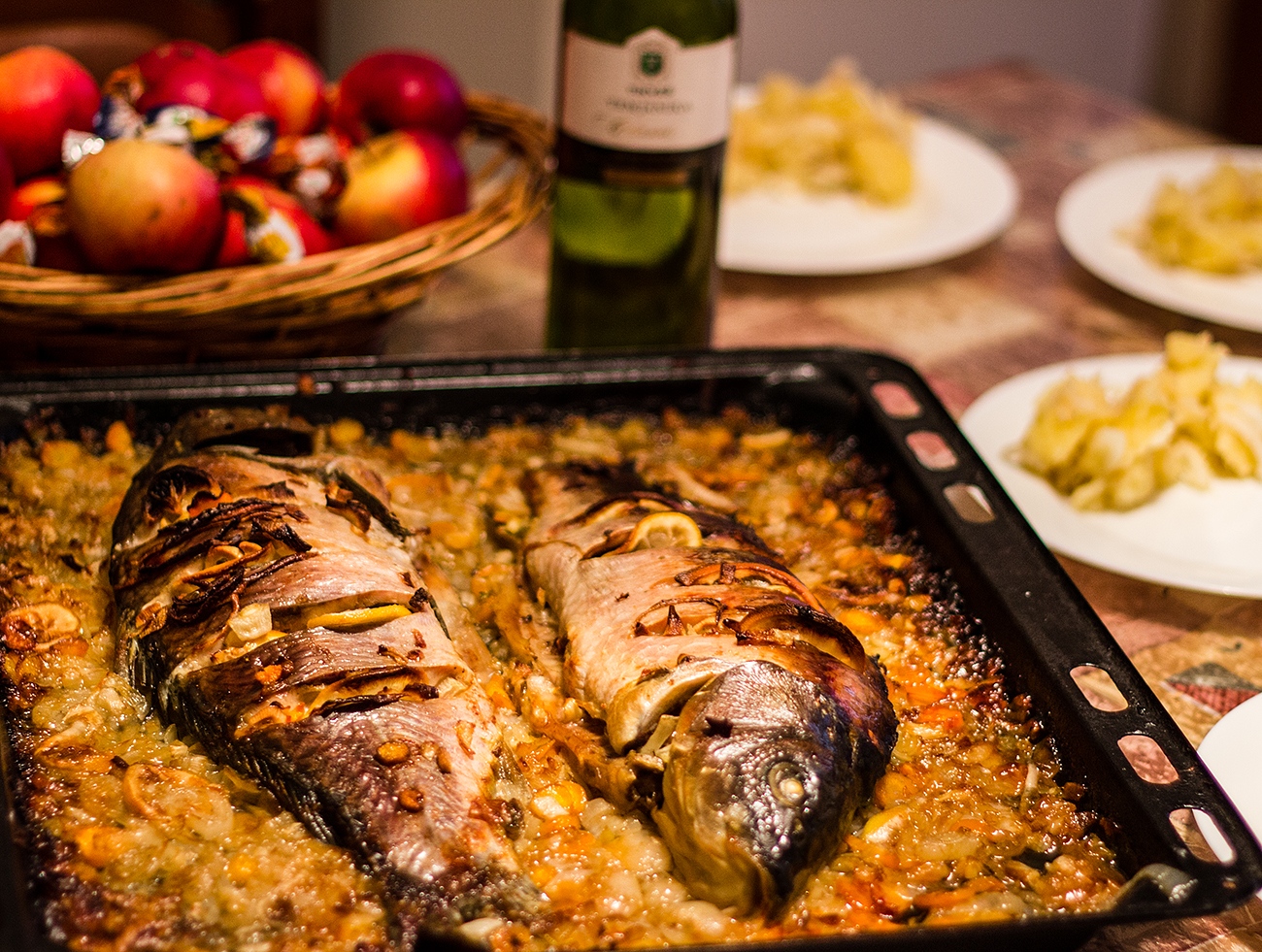 Přidáme porce kapra, dáme do trouby a necháme zapéct po obou stranách dozlatova.