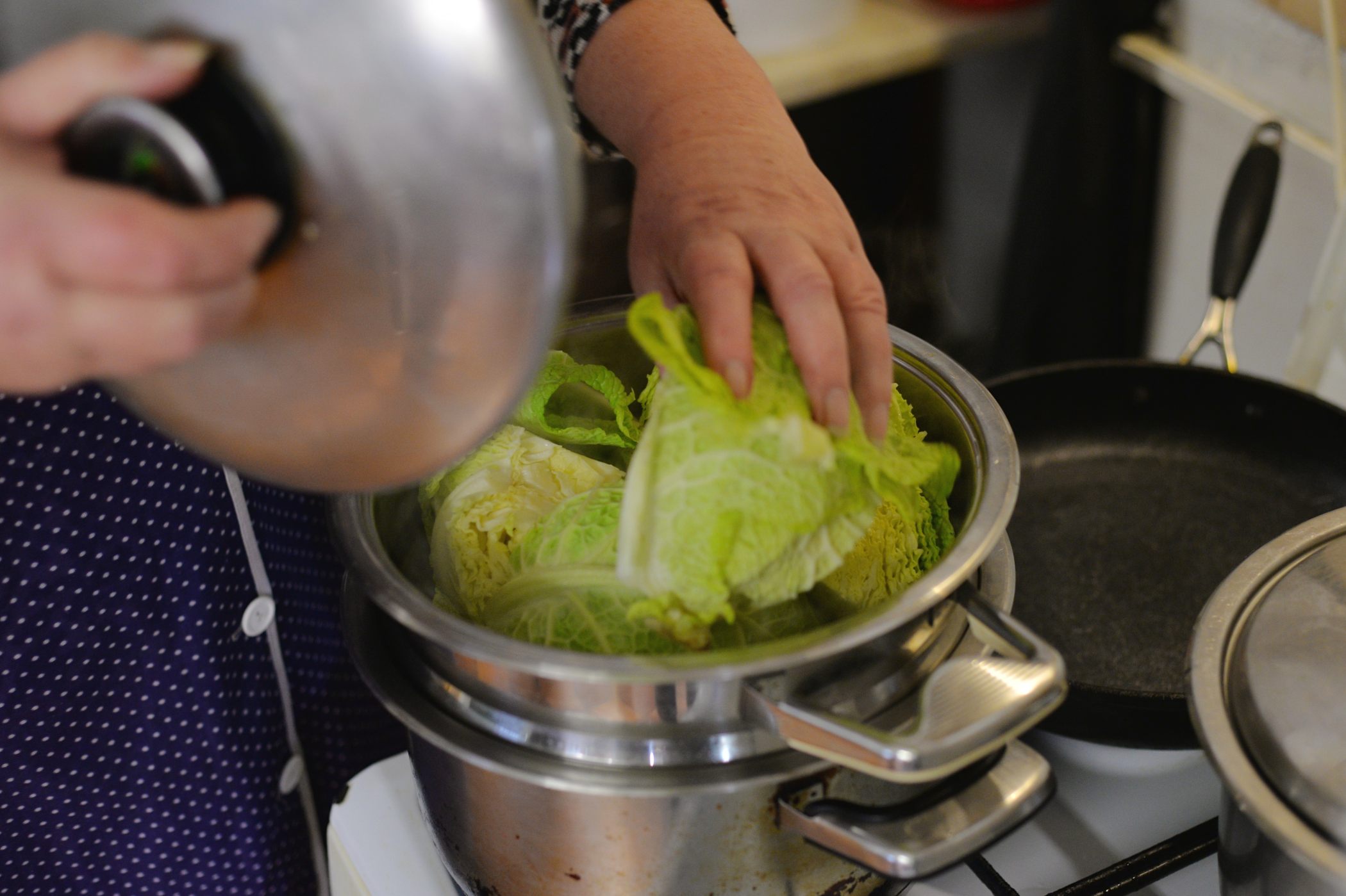- Kapustové listy nejprve vaříme asi 10 minut. Poté je scedíme.
