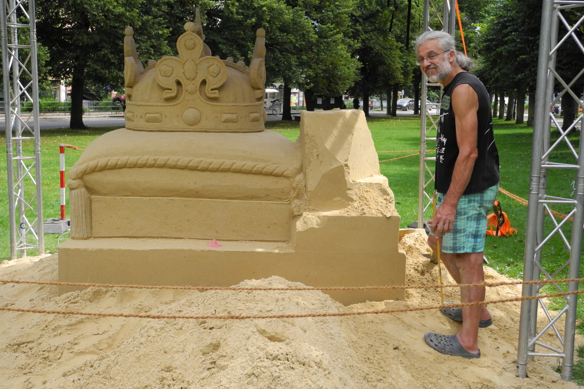 Jihočeský umělec Tomáš Bosambo Dostál dokončil v Karlových Varech v pořadí třetí a zároveň poslední pískovou sochu. Po soše znázorňující Karla IV. a Zámeckou věž přišly na řadu české korunovační klenoty.