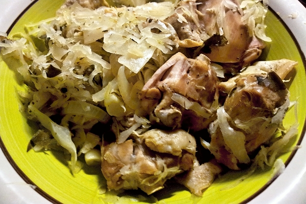 Na zelí položíme rozpůlené kuře kůží nahoru, poklademe plátky slaniny a máslem, které osolíme a opepříme.