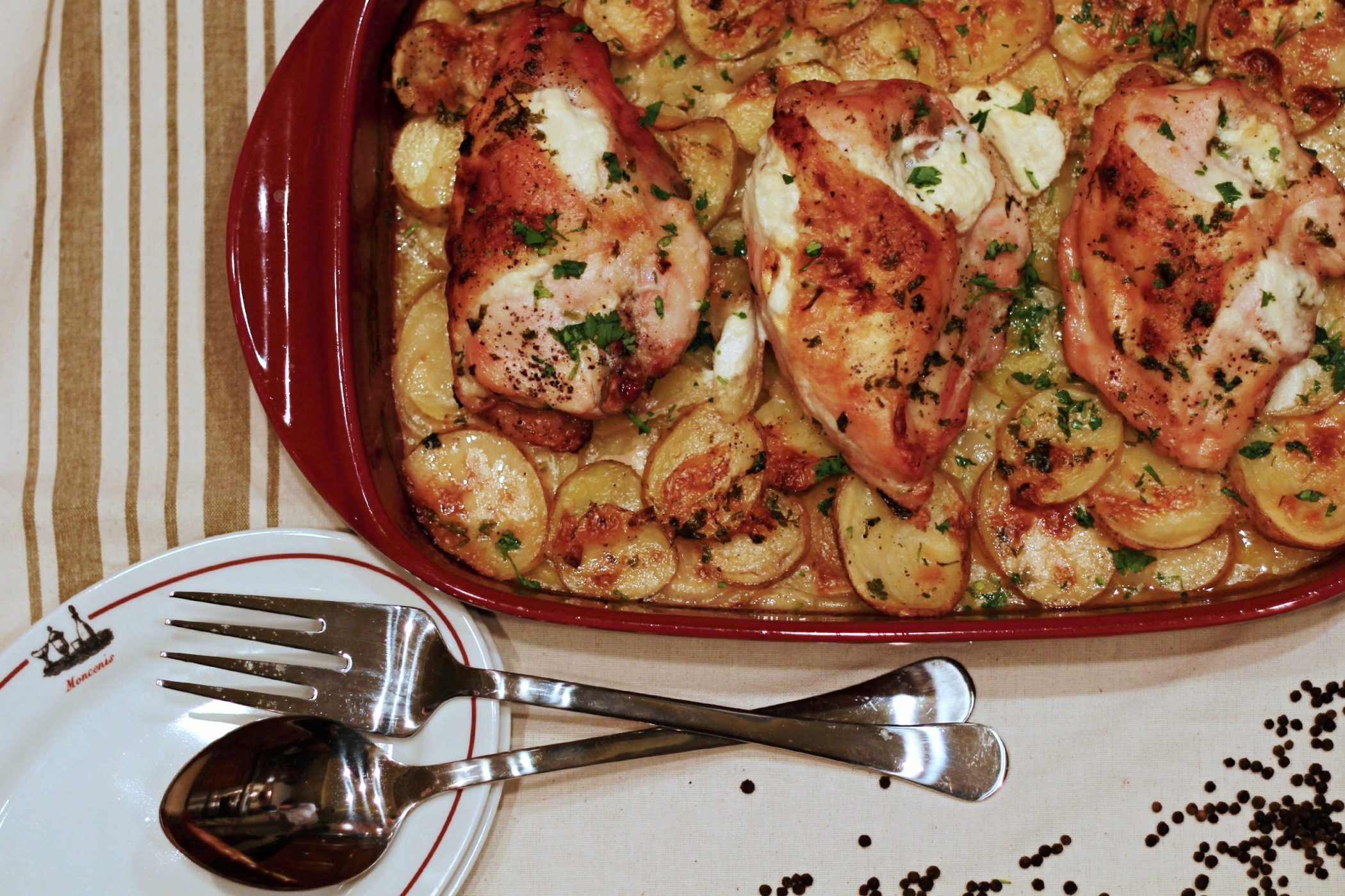 Prsíčka nakrájíme, jemně naklepeme a položíme na brambory. Mírně opaprikujeme, osolíme a opepříme. Maso potřeme hořčicí.