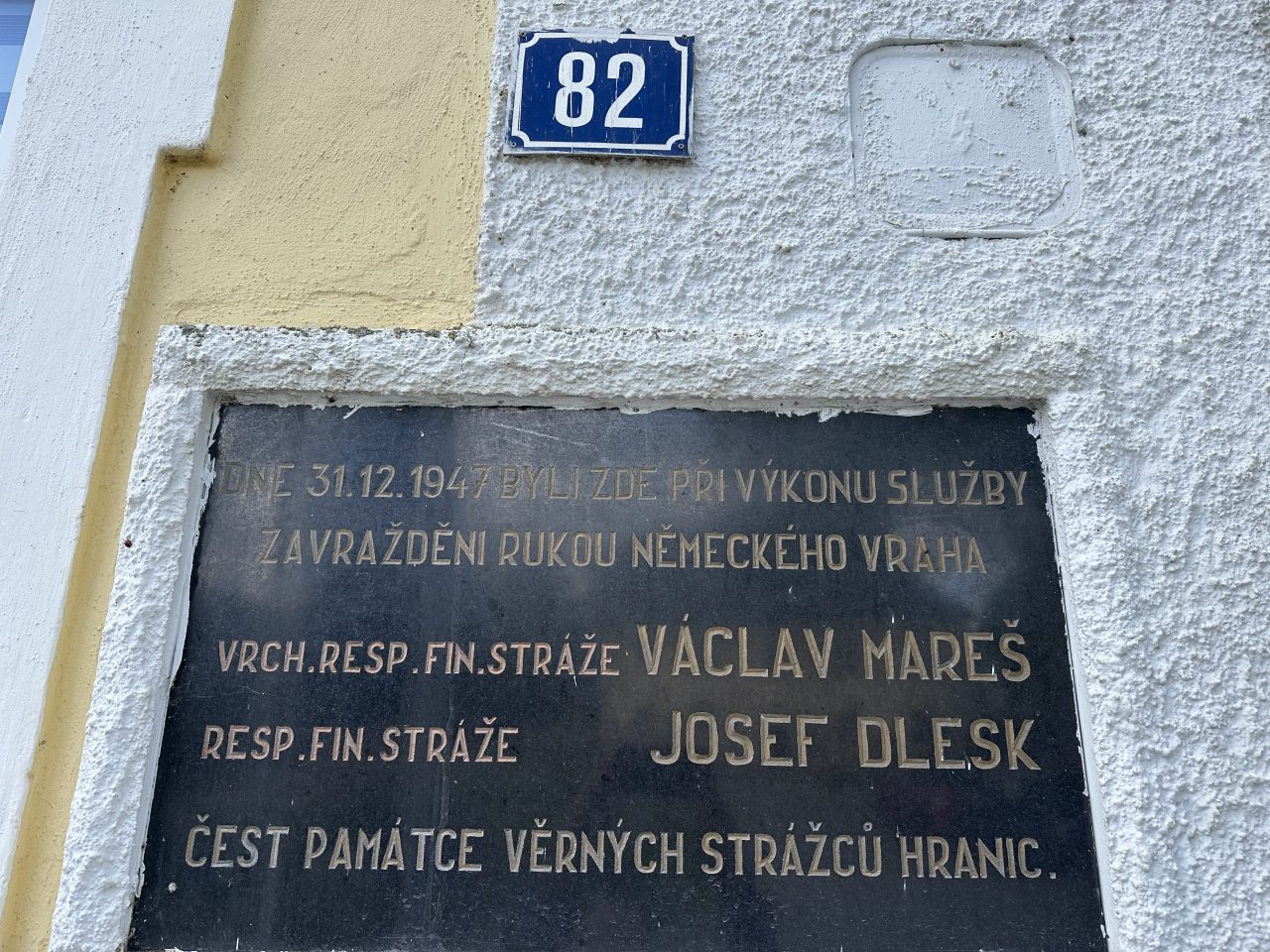 S bývalou starostkou obce Dagmar Strnadovou stojíme před obecním úřadem. Díváme se na znak obce. Kromě tří seker je na něm i jedle.