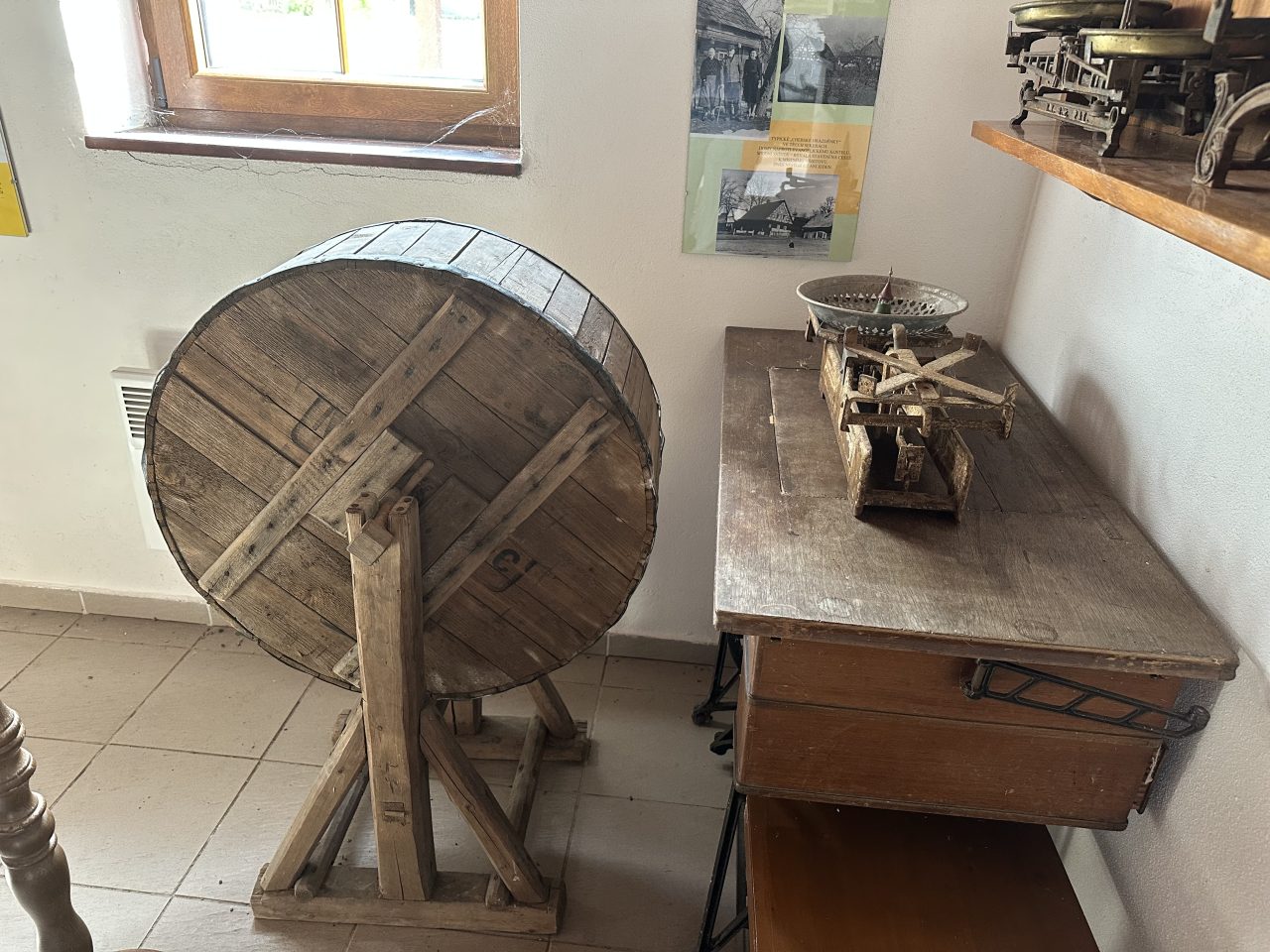 Jedním ze zajímavých exponátů je věc, která k obci neodmyslitelně patří. „Jde o výrobu dřevěných perel, což byla obživa místních lidí, kteří zde bydleli před válkou. Téměř každý měl doma takový přístroj. On je to vlastně soustruh,“ upřesňuje Dagmar Strnadová.