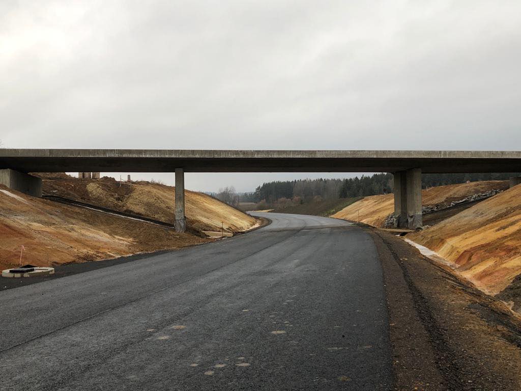 Součástí nového obchvatu, který je dlouhý zhruba 5 kilometrů, je celkem 6 mostních objektů. Pouze dva ale vedou nad novou komunikací. „Jedná se o most přes hlavní trasu obchvatu. Je to most na silnici třetí třídy, který spojuje obci Drmoul s částí Hamrníky. Ještě na té stavbě máme jeden most, který je veden přes hlavní trasu. Nachází se na mimoúrovňovém křížení na začátku trasy ve směru na Cheb,“ popsal ředitel karlovarské správy ŘSD Lukáš Hnízdil.