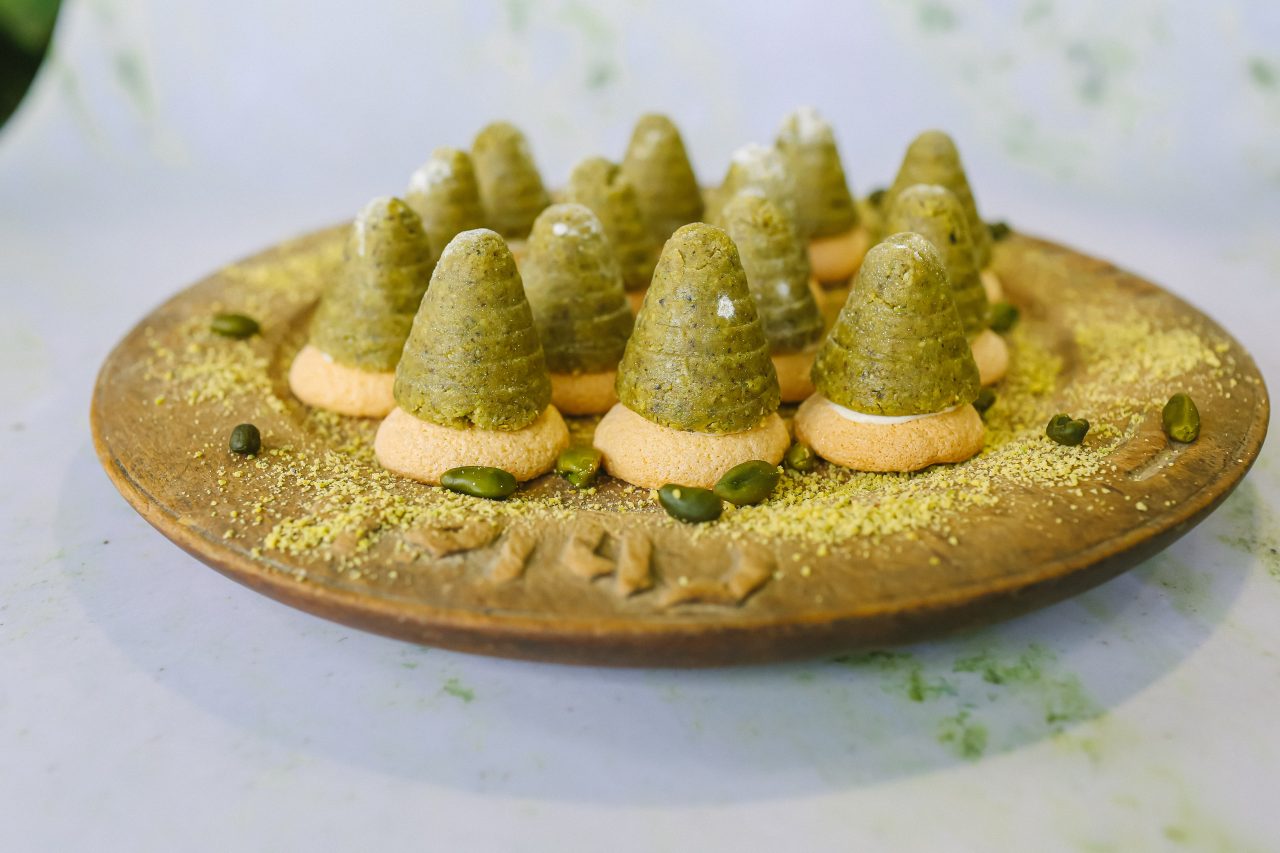 Pistáciové včelí úly podle Josefa Maršálka sedí na luxusním domácím piškotu a jsou plné krému