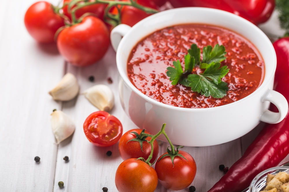 - Rajčata dejte spolu s opraženým kmínem, česnekem, cibulí a listy řeřichy do mixéru a mixujte do hladka.