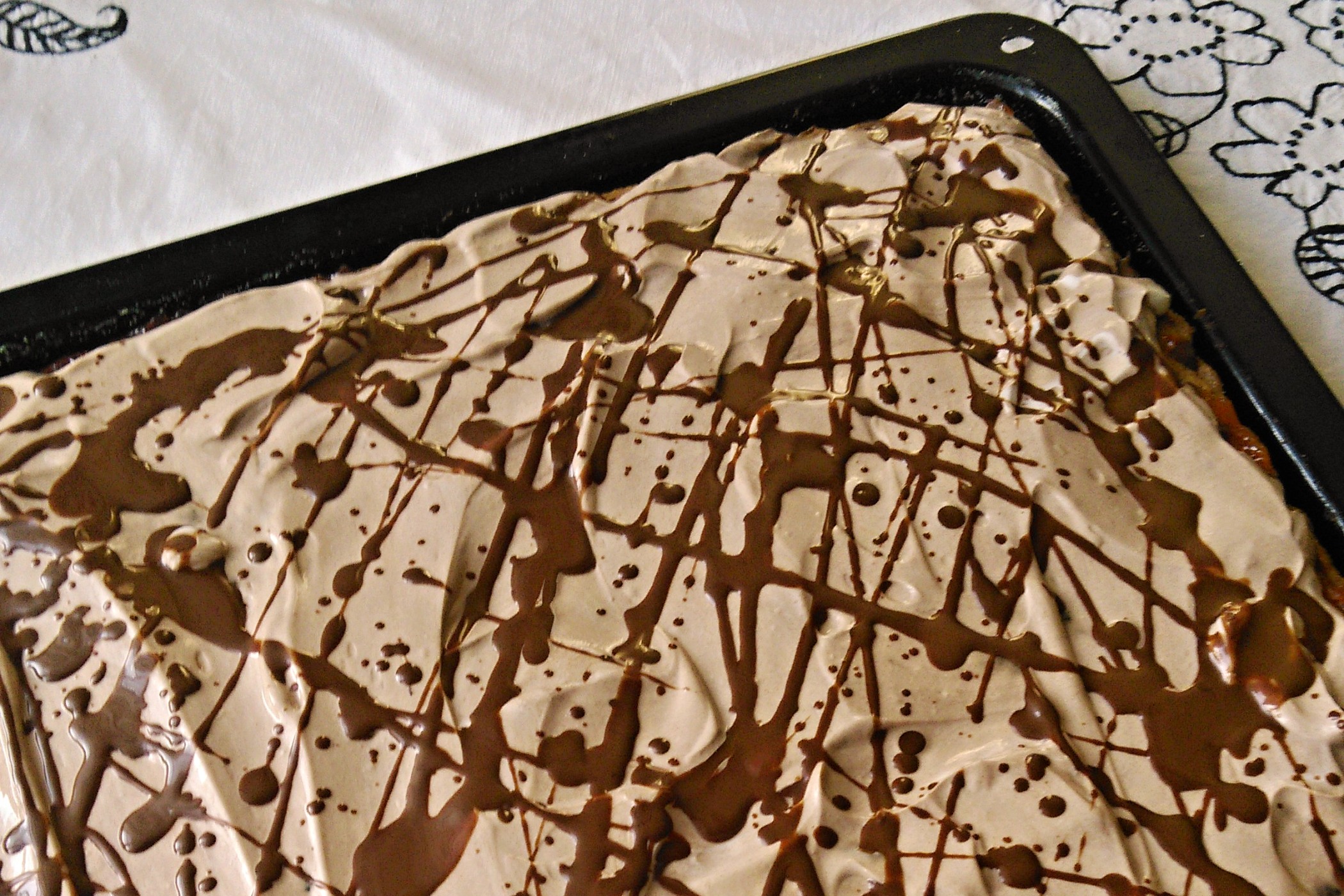 Čokoládu na vaření rozpustíme ve vodní lázni, a když vychladne, tak ji (cca ¾) vmícháme do smetany. Tímto smetanovým krémem potřeme celou plochu moučníku. Po krátkém odpočinutí, kdy krém alespoň trochu ztuhne, postříkáme povrch zbylou čokoládou.