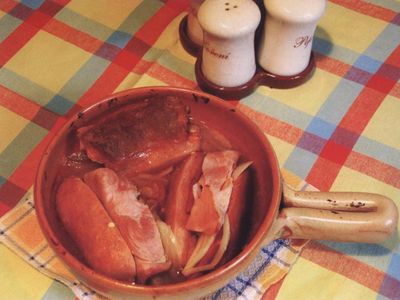 Špekáčky oloupeme a podélně nakrojíme. Cibuli nakrájíme na kolečka, papriku na nudličky. Špekáčky naplníme cibulí a paprikou, naskládáme do vymazaného pekáčku, přidáme zbylou cibuli a papriku, posypeme tymiánem. Kečup smícháme z hořčicí a směsí zalijeme špekáčky. Podle chuti osolíme a opepříme. Prohřejeme ve vyhřáté troubě 5 minut a zalijeme pivem. Přiklopíme a zvolna pečeme asi 1/2 hodiny.
