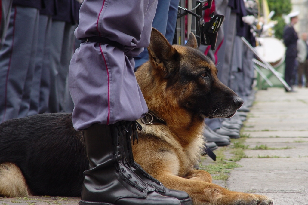 Policista se na papouška podezíravě podívá.