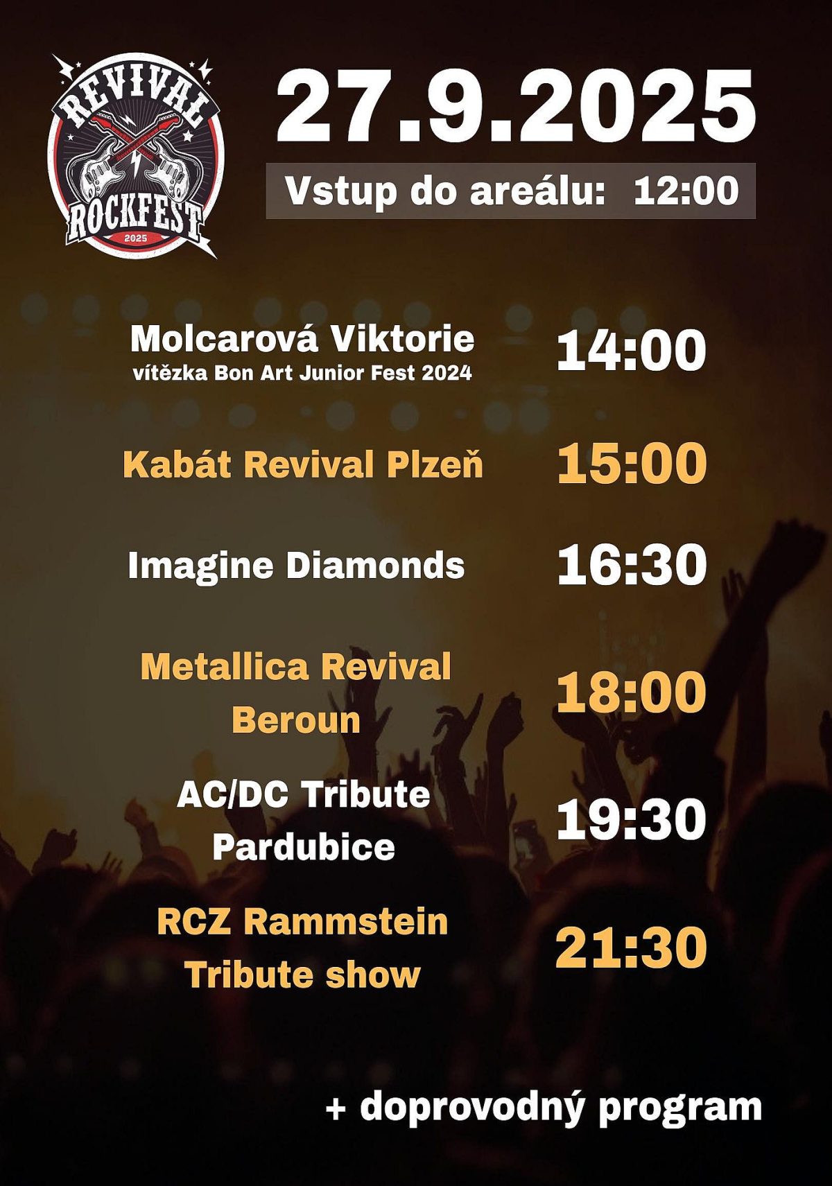 Imagine Diamonds, Metallica Beroun, Kabát Revival Plzeň, AC/DC Tribute a Rammstein Tribute Show zahrají na festivalu předních českých revivalových kapel. Jako host vystoupí Viktorie Molcarová, vítězka pěvecké soutěže Bon Art Junior Fest 2024. Akce má i charitativní podtext: část vstupného bude použita na úhradu pomůcek pro malého Damiána, který trpí poruchou autistického spektra. Díky získaným penězům se bude moci vzdělávat ve speciální škole v Merklíně. Festival se koná v plzeňském Škodalandu v sobotu 27. září od 13 do 23 hodin.