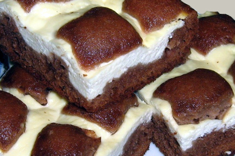 V teplém mléce rozpustíme čokoládu a vlijeme ji do připravené směsi. Promícháním vytvoříme těsto, které zlehčíme sněhem z bílků a vanilkového cukru.