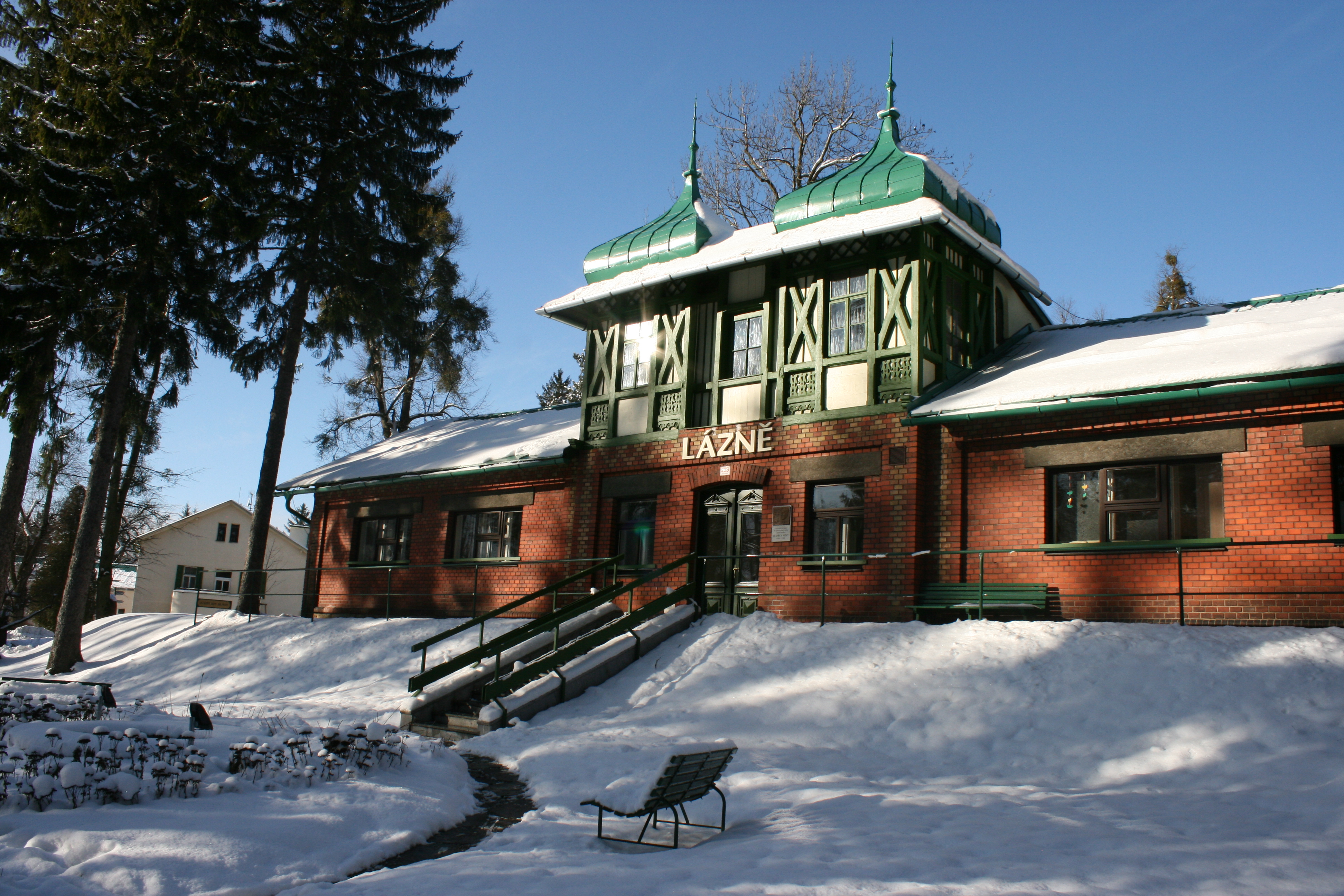 V desetihektarovém parku se vzrostlými stromy stojí dodnes také historická budova původních lázní z počátku 20. století, kde se mimo jiné dvakrát léčil herec Oldřich Nový. Připomíná jej tu reliéf s textem: „Jen pro ten dnešní den stojí za to žít.“ Spolu s Lázeňským domem Ondřejka patří budova starých lázní k ukázce architektury tak zvaného norského stylu.