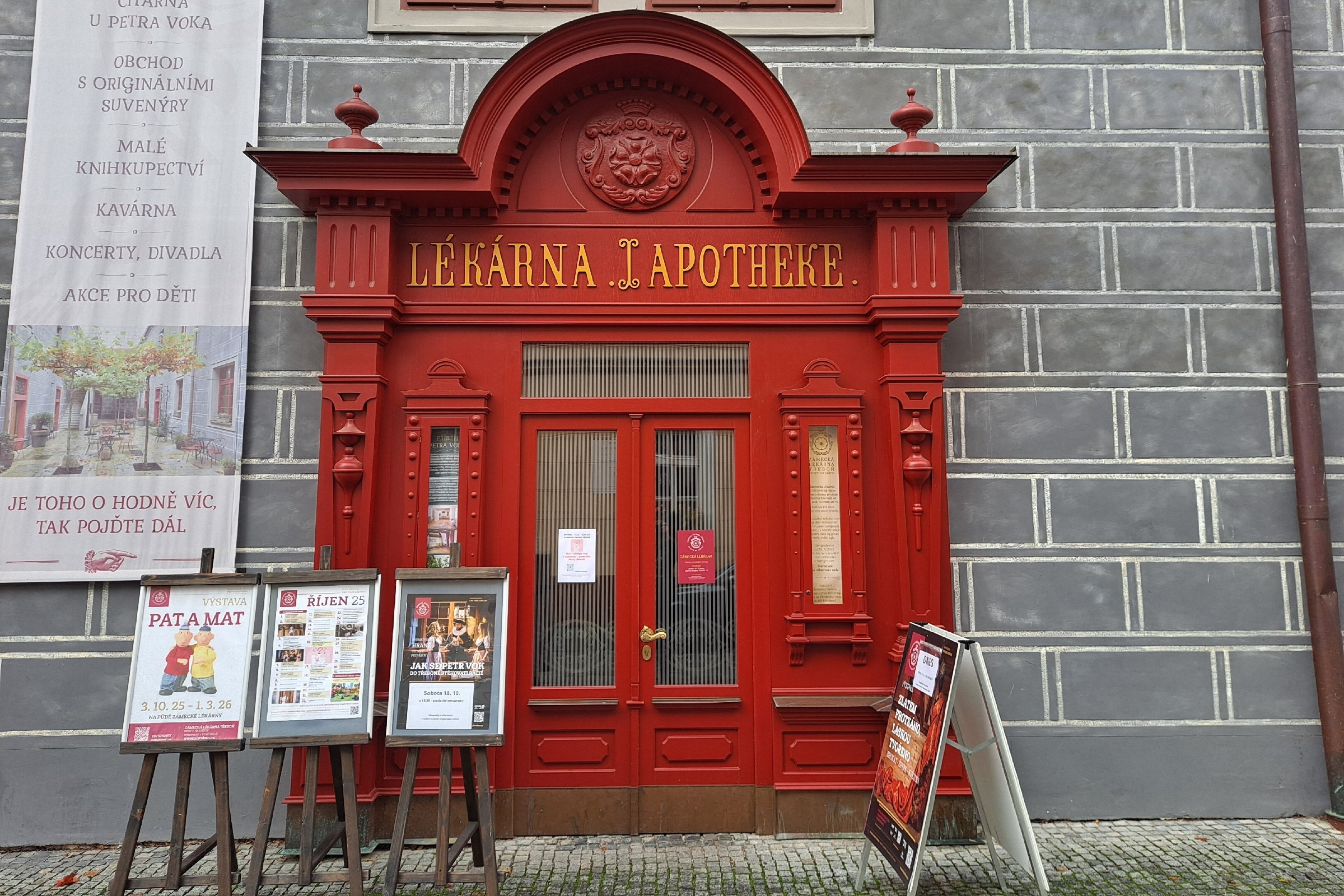 Nádherný dům s renesanční fasádou a výraznými, červeně natřenými dveřmi, nad kterými je ve zlatě vyvedený nápis. To je Zámecká lékárna v centru jihočeské Třeboně. Před ní stojí pro jistotu stojan s upozorněním, že uvnitř žádné léky nekoupíte, protože tyto historické prostory dnes slouží jako galerie, muzeum nebo studovna. I když lékárnu tam taky najdete.