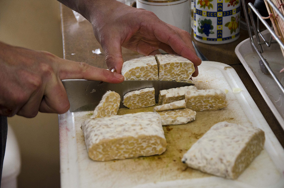 - Tempeh nakrájíme na užší plátky nebo na kostičky.