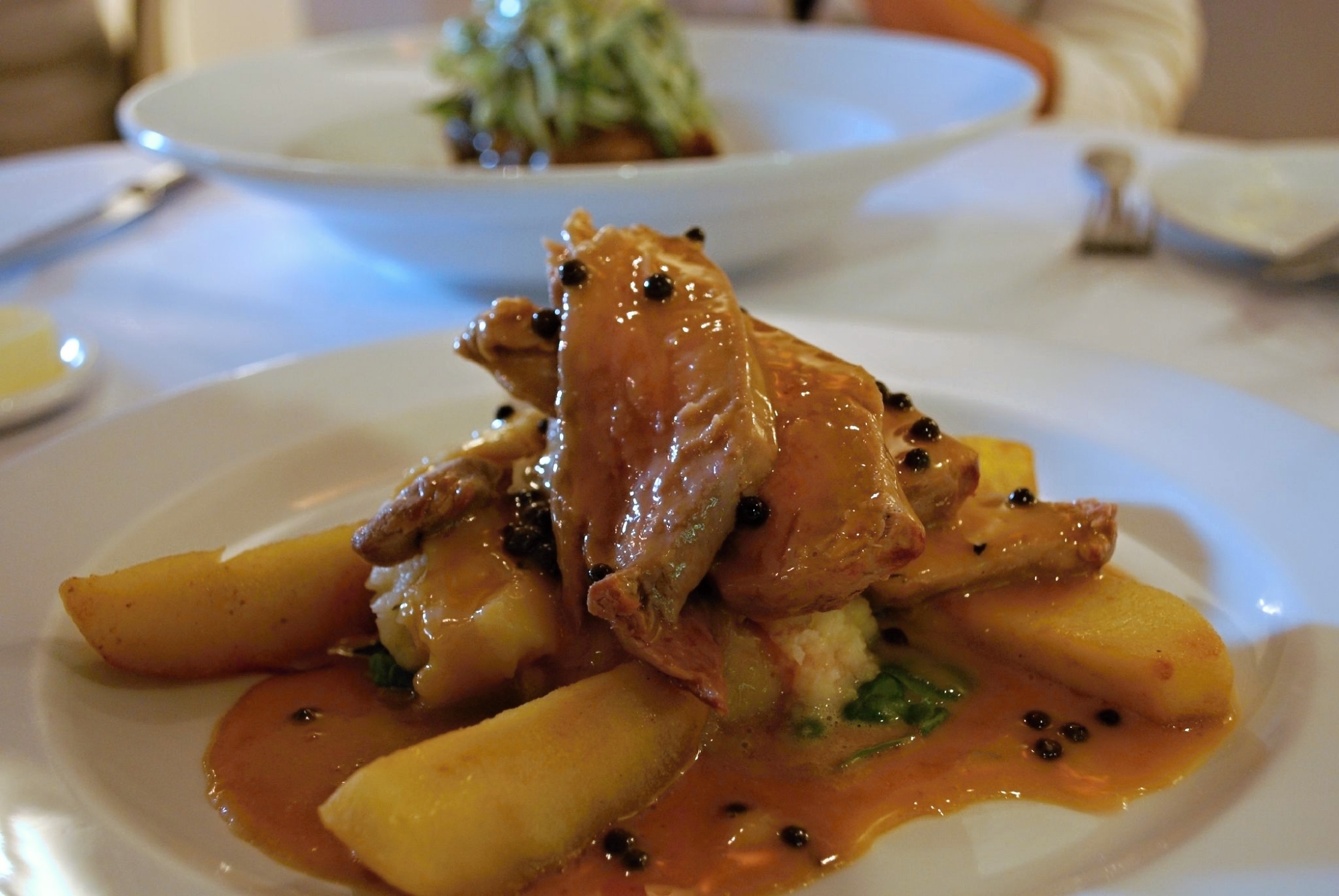 Na talíře naservírujeme květákové pyré, na pyré položíme opečené maso a obložíme zkaramelizovanými jablky.