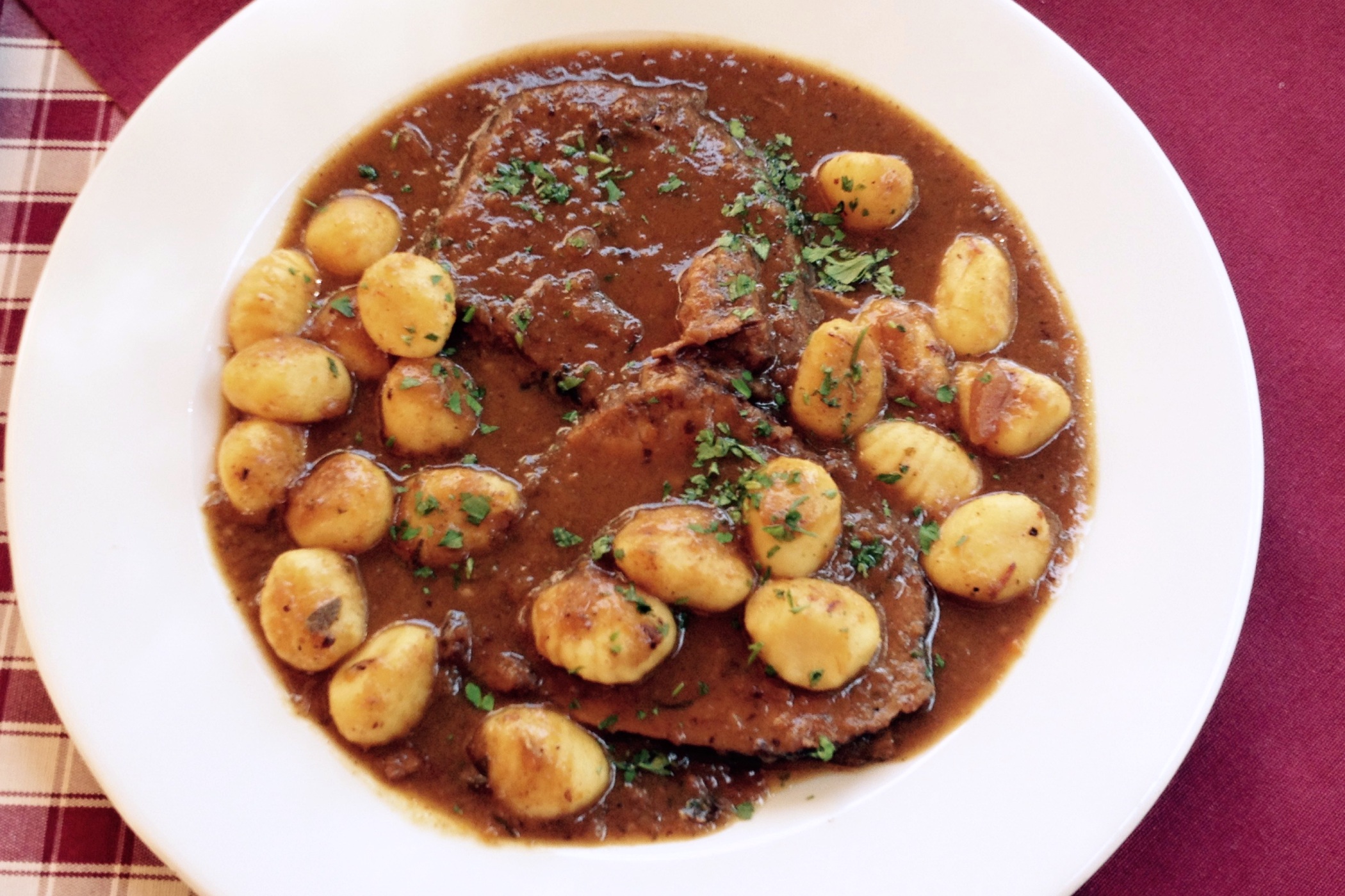 Do základu vložíme marinované maso, osolíme, opepříme a ochutíme mletým muškátovým oříškem a ze všech stran prudce opečeme. Podlijeme vínem, přidáme rajčatový protlak maso a velmi pomalu dusíme do změknutí. Během dušení maso obracíme a podléváme zbylým vínem a vývarem.